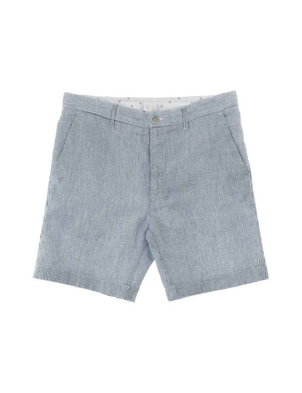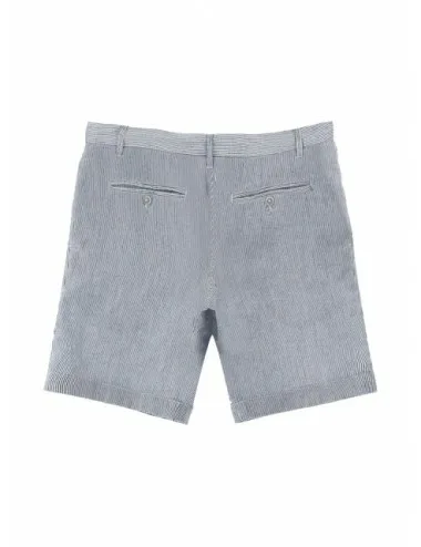Bermuda curta amb fines ratlles blaves i blanques. Té butxaques laterals i al darrera. Teixida amb lli de primera qualitat de la marca 120% Lino