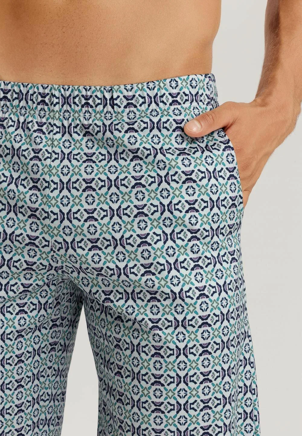 Éste es el pijama perfecto para el verano: diseño discreto, máxima comodidad y tejido de alta calidad. Este conjunto consta de una camiseta de color liso y un pantalón corto con un sutil estampado con una cómoda cintura y dos bolsillos laterales. Cuando empiezan a subir las temperaturas, nos gusta llevar ropa de dormir de algodón 100%: esta fibra natural es transpirable, agradable para la piel y ofrece mucha libertad de movimiento mientras dormimos. El jersey sencillo, suave y blando, es un auténtico lujo para la piel.