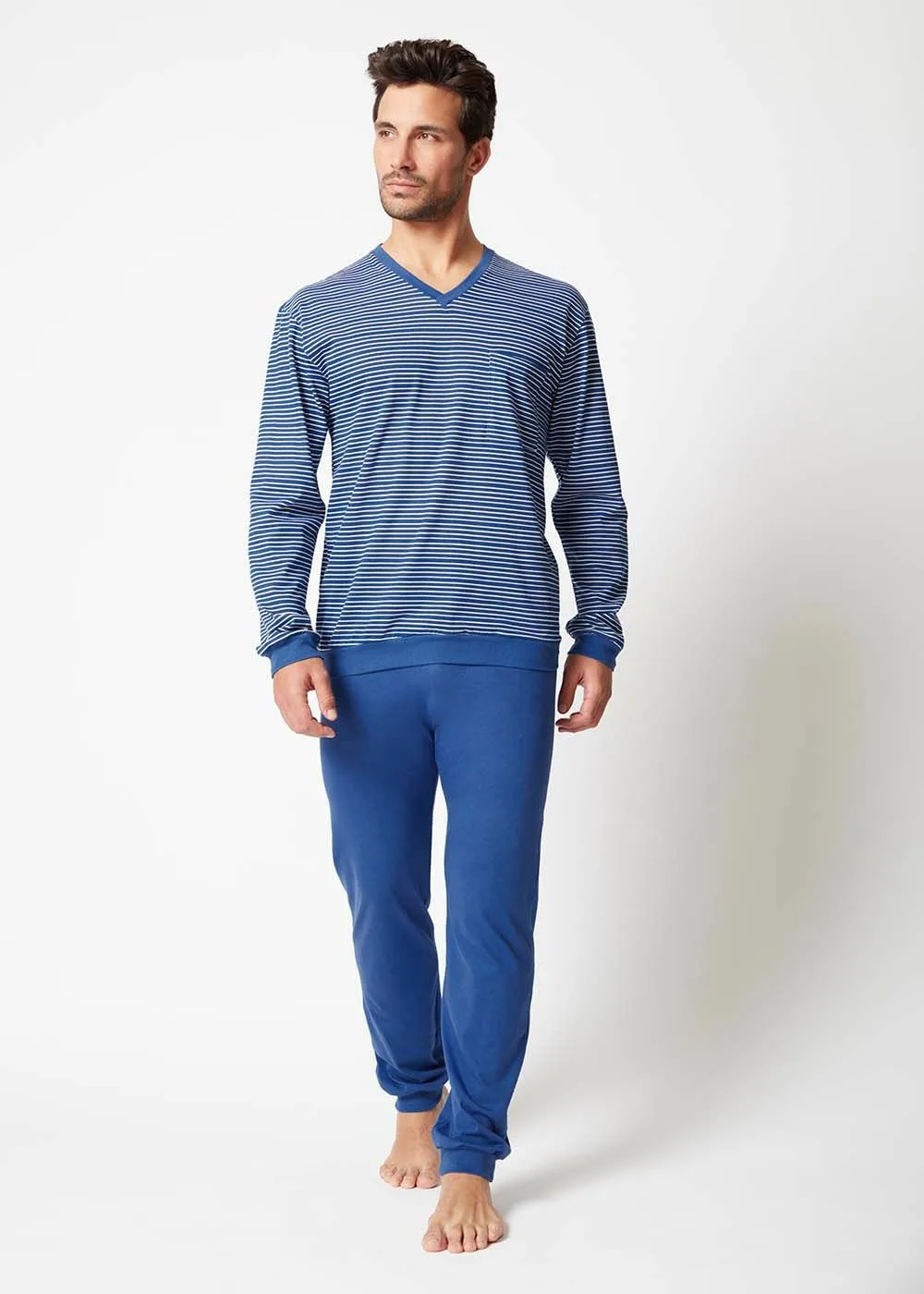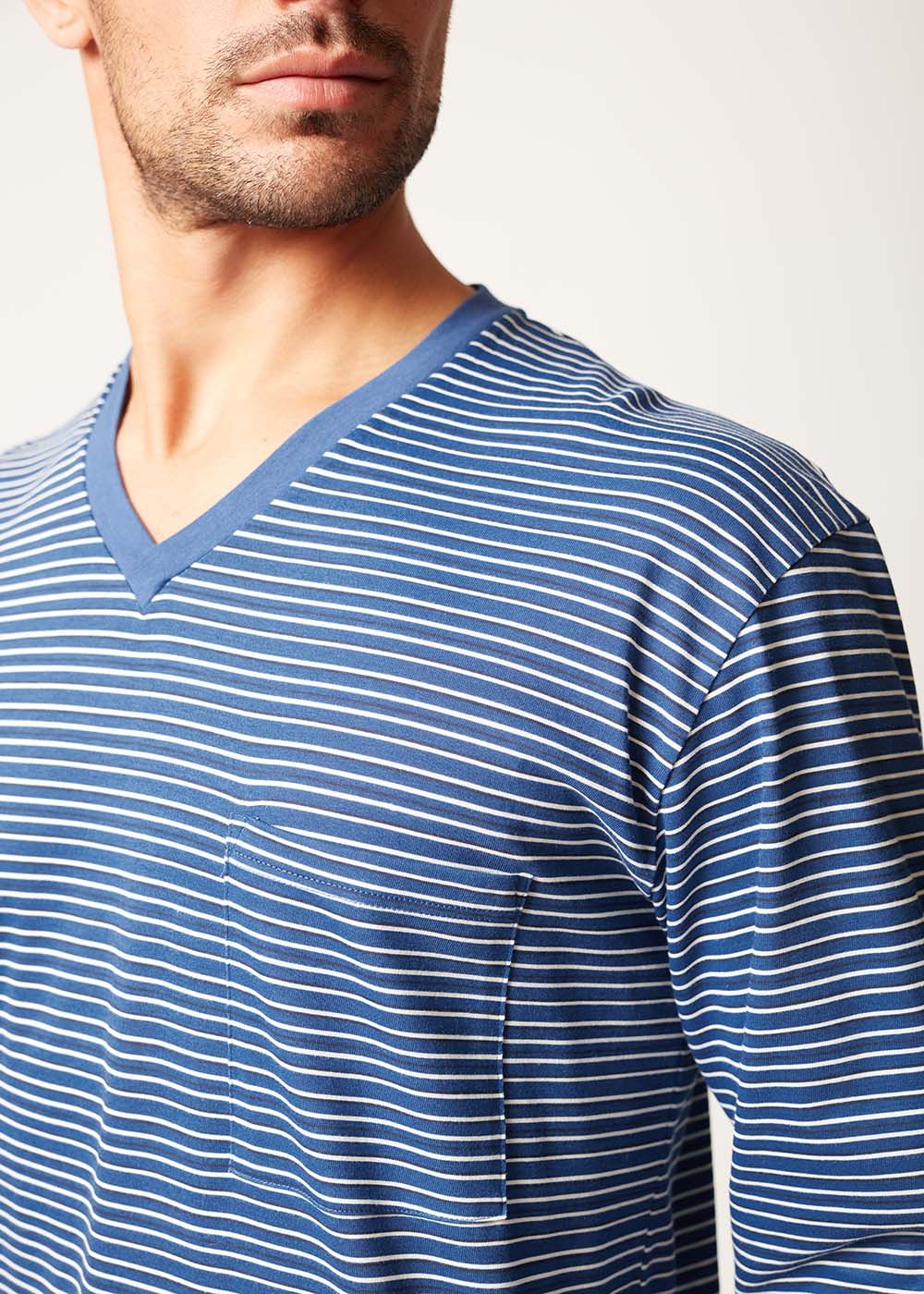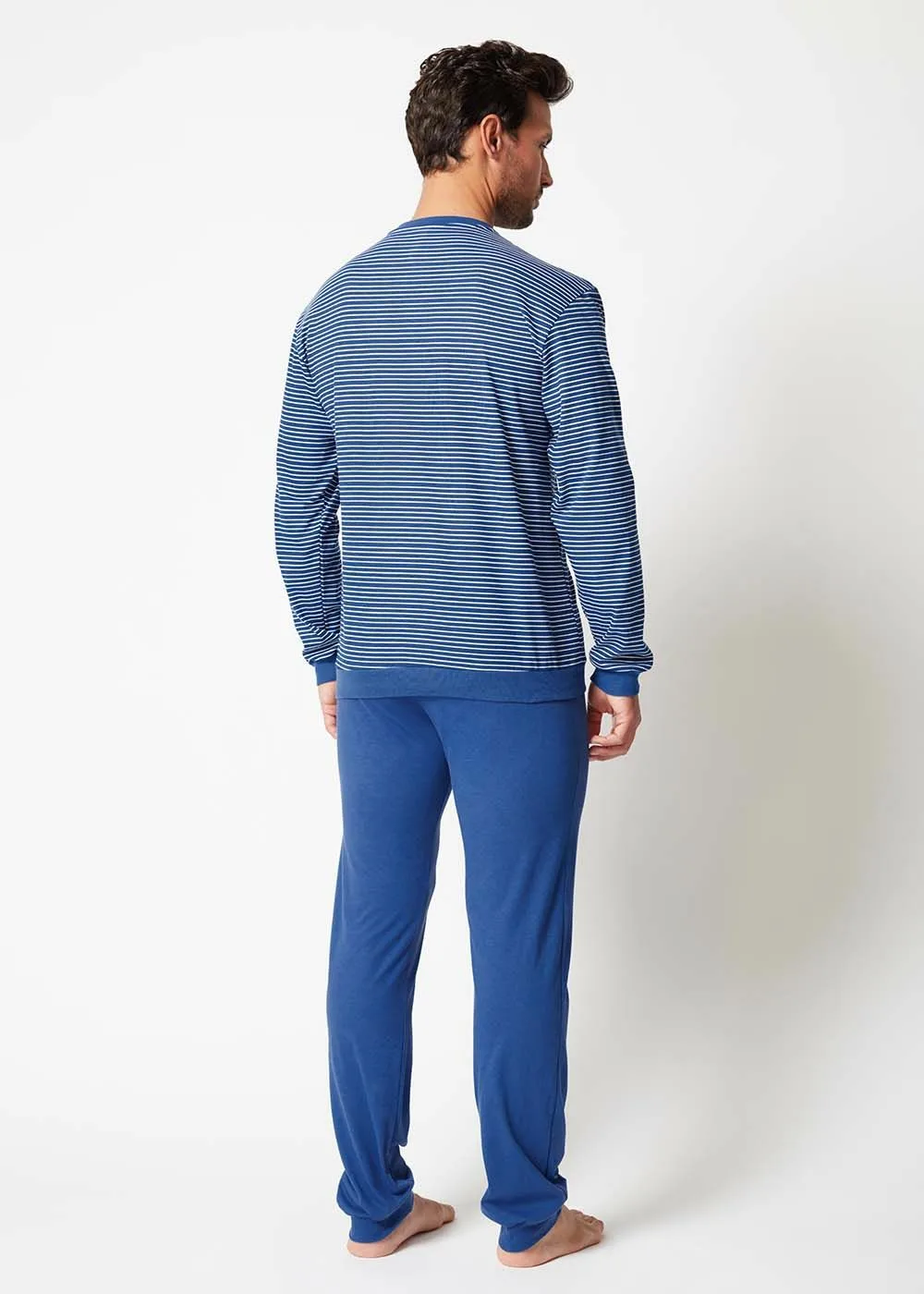 Aquest còmode conjunt de pijama es compon d’una samarreta de màniga llarga amb escot de bec i butxaca al pit i uns pantalons de pijama llarg amb punys de disseny atemporal. Gràcies al cotó d´alta qualitat, els pijames ofereixen la màxima comoditat, fins i tot durant el dia són l´elecció perfecta per descansar i relaxar-se.
